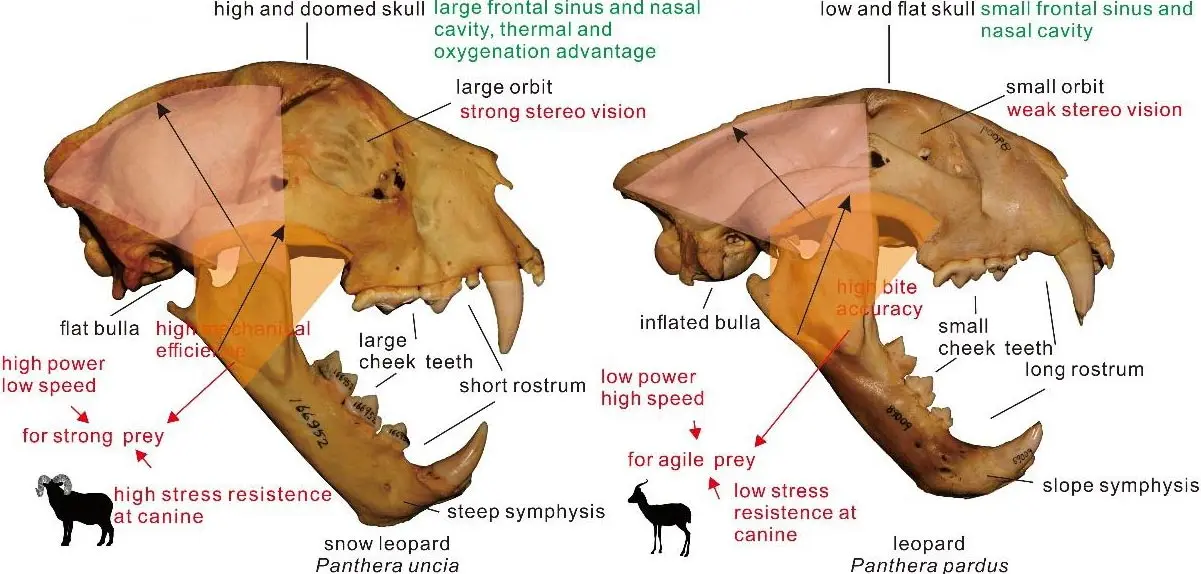 这项研究强调了雪豹与它们更常见的表亲区别开来的独特特征。普通的豹子天生就能在部分森林栖息地捕捉敏捷的猎物,而雪豹则进化出了独特的特征,主宰了崎岖的山地景观。它们包括更大的牙齿,圆顶的头骨,更强壮的颌和爪子,这些都是对付像山羊这样强壮、肌肉发达的猎物的完美工具。